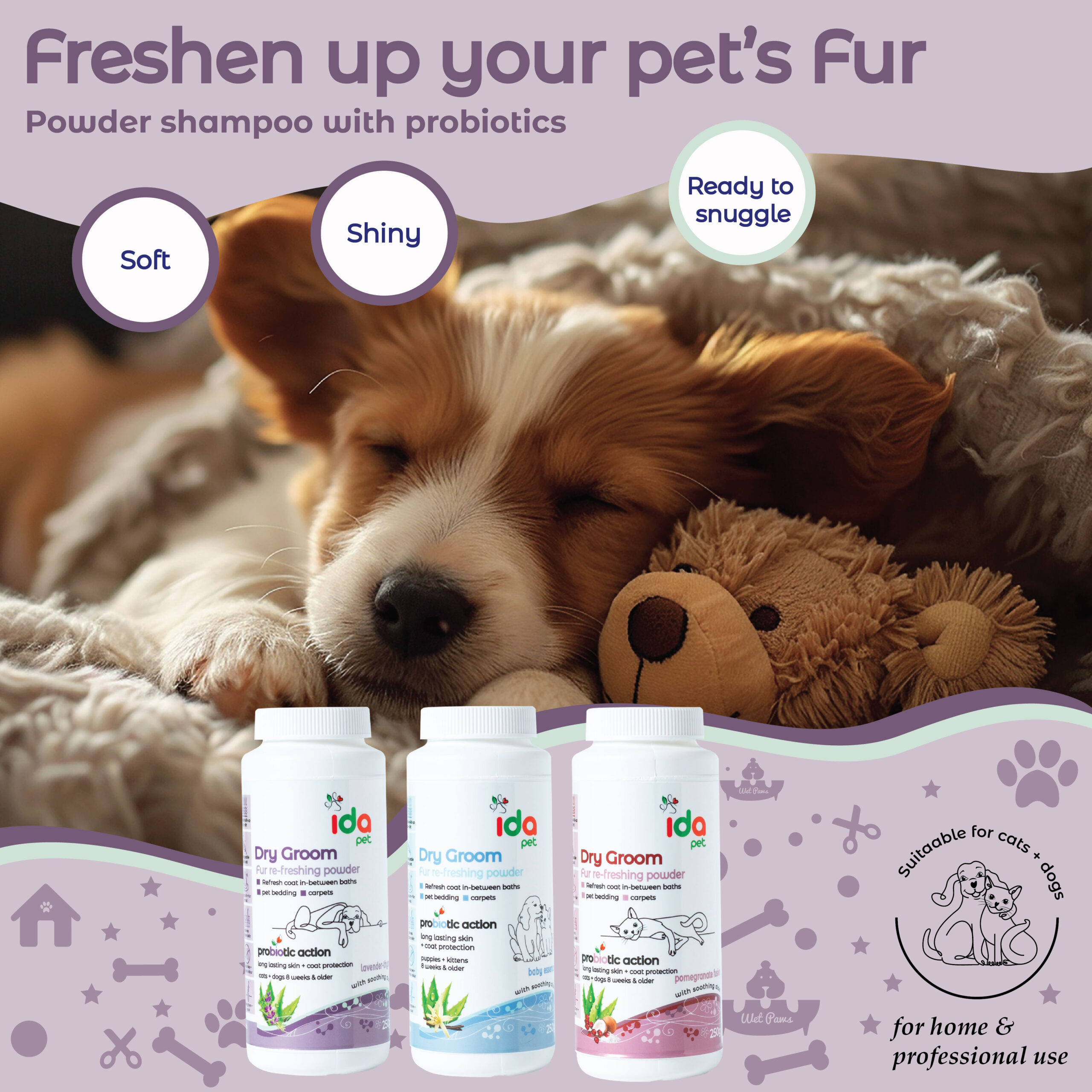 - Dry Groom is a great way for keeping your pet clean while giving their wounds time to heal. This safe, gentle, but incredibly effective powder shampoo is a valuable addition to your grooming routine. You can even use it to re-freshen carpets, pet bedding, and more.