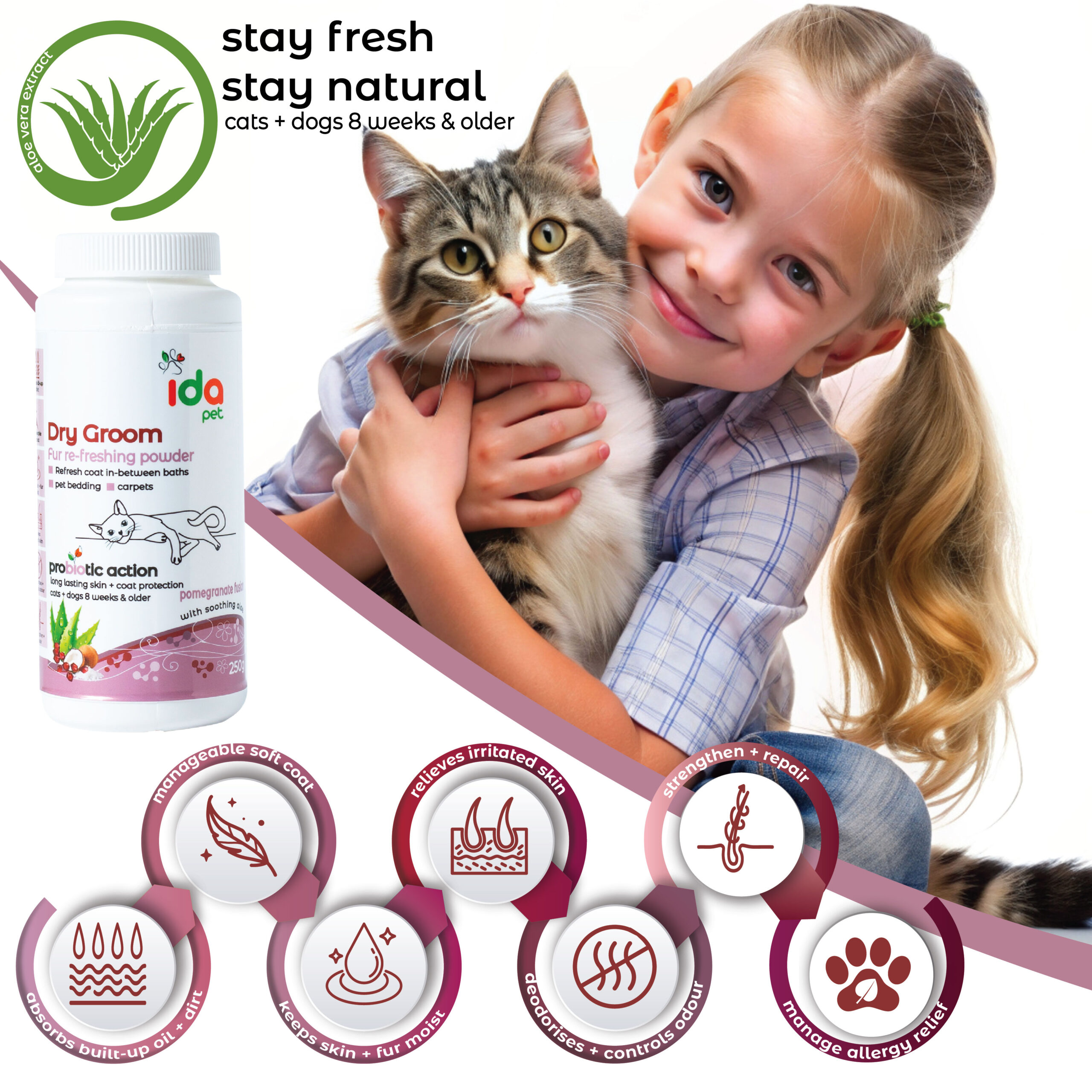 - This natural fur re-freshening powder cleanses your pet’s skin & fur by gently lifting away & absorbing built up oils + dirt.